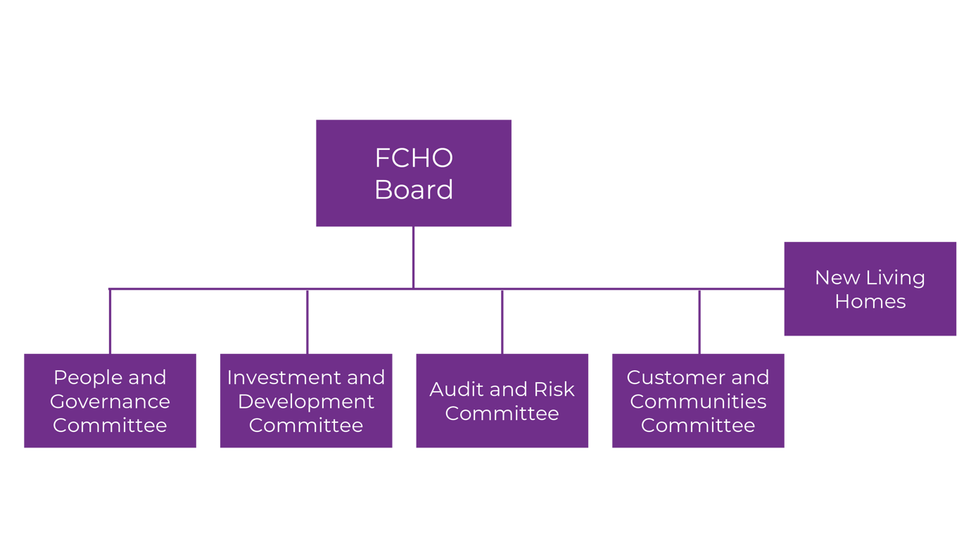 The Board has ultimate responsibility and control of the Group’s corporate governance and financial regulation arrangements and affairs. Its central role is to lead, direct, control, scrutinise and evaluate First Choice Homes Oldham. This includes determining strategic direction and policies, establishing and overseeing control and risk management frameworks, satisfying itself on the integrity of financial information and ensuring that First Choice Homes Oldham achieves its aims and objectives.